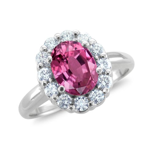 This gorgeous Sapphire and Diamond Engagement Ring is inspired by Princess Diana's engagement ring from Prince Charles! Her engagement ring has a large oval sapphire surrounded by round brilliant cut diamonds. Diana's ring has been gifted to her son, Prince William, who is going to wed Kate Middleton with this stunning ring. This sapphire ring is delicately crafted in glistening 18k white gold with a 7 x 5 mm oval shaped pink sapphire surrounded by sparkling round brilliant cut diamonds. The vivid pink glow of sapphire and dazzling icy white diamonds make this engagement ring a beautiful expression of love. The band is 2mm thick. The center stone is a 7 x 5 mm genuine pink sapphire.